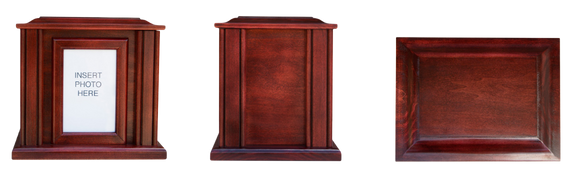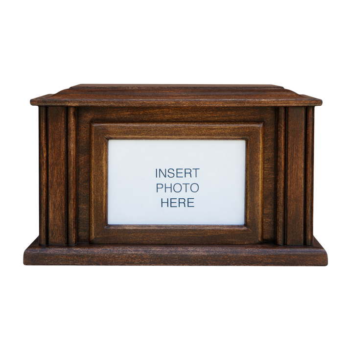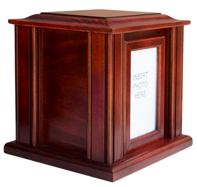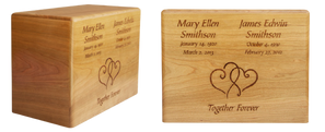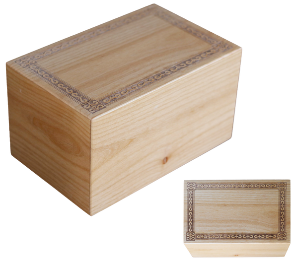 This urn showcases the natural beauty of Alder wood with a natural finish and custom engraved border.